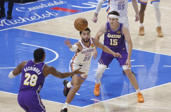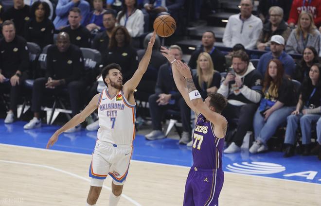 首節(jié)開局,湖人反客為主,八村塁三分命中以后,7-2領(lǐng)先。但雷霆這邊多點開花,亞歷山大不斷得分,立馬回敬一波12-3的小高潮反超5分,15-10進入暫停?;氐奖荣?,切特造犯規(guī)罰球,艾頓打一個2+1。但此后湖人陷入得分荒,被雷霆拉開分差落后兩位數(shù)。東契奇打2+1止血以后,卡魯索中投、亞歷山大三分再中。里夫斯上籃打進以后,首節(jié)結(jié)束湖人18-30落后12分。