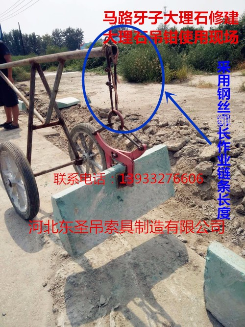 石材夾具替代鏈條作業(yè)使用案例分析,為您講述使用夾路沿石鉗子替代鏈條優(yōu)勢??蛻糁码娮稍儯跏膴A子替代鏈條吊裝大理石板材。
